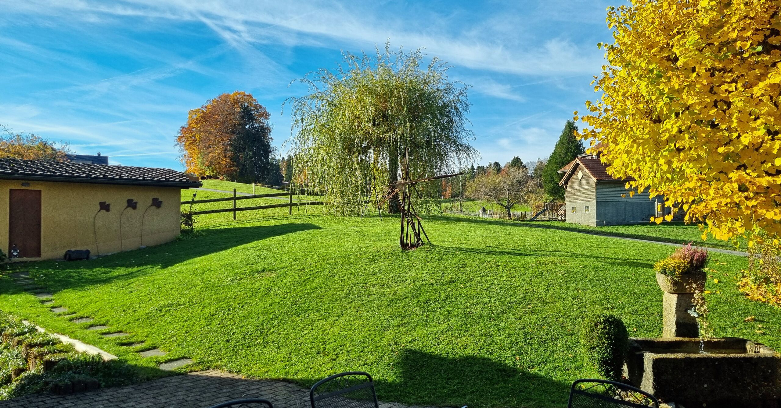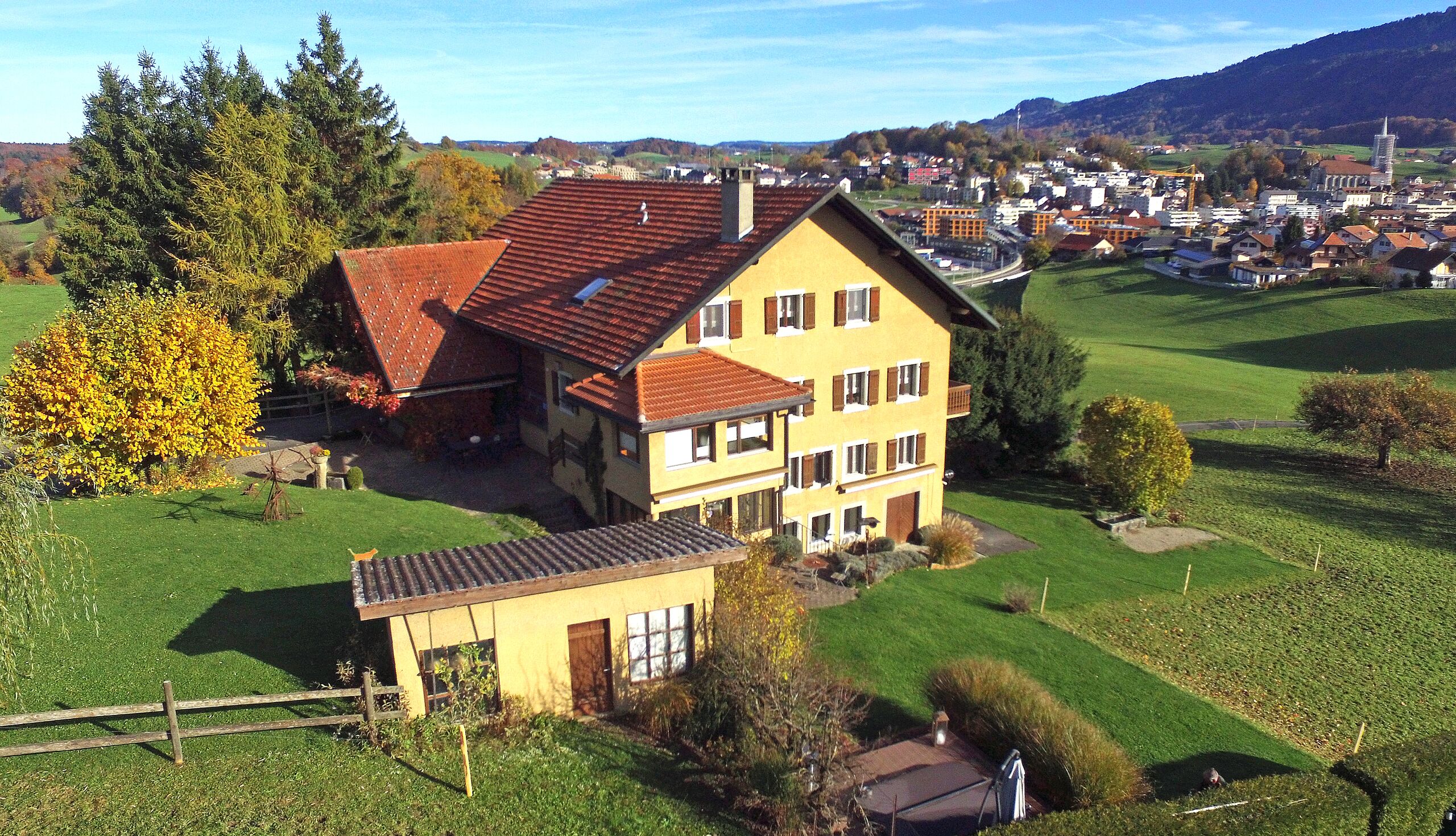 Dans sa partie plus privative, un beau jacuzzi permettra à ses propriétaires de profiter de moments relaxants avec une superbe vue sur les Préalpes fribourgeoises !